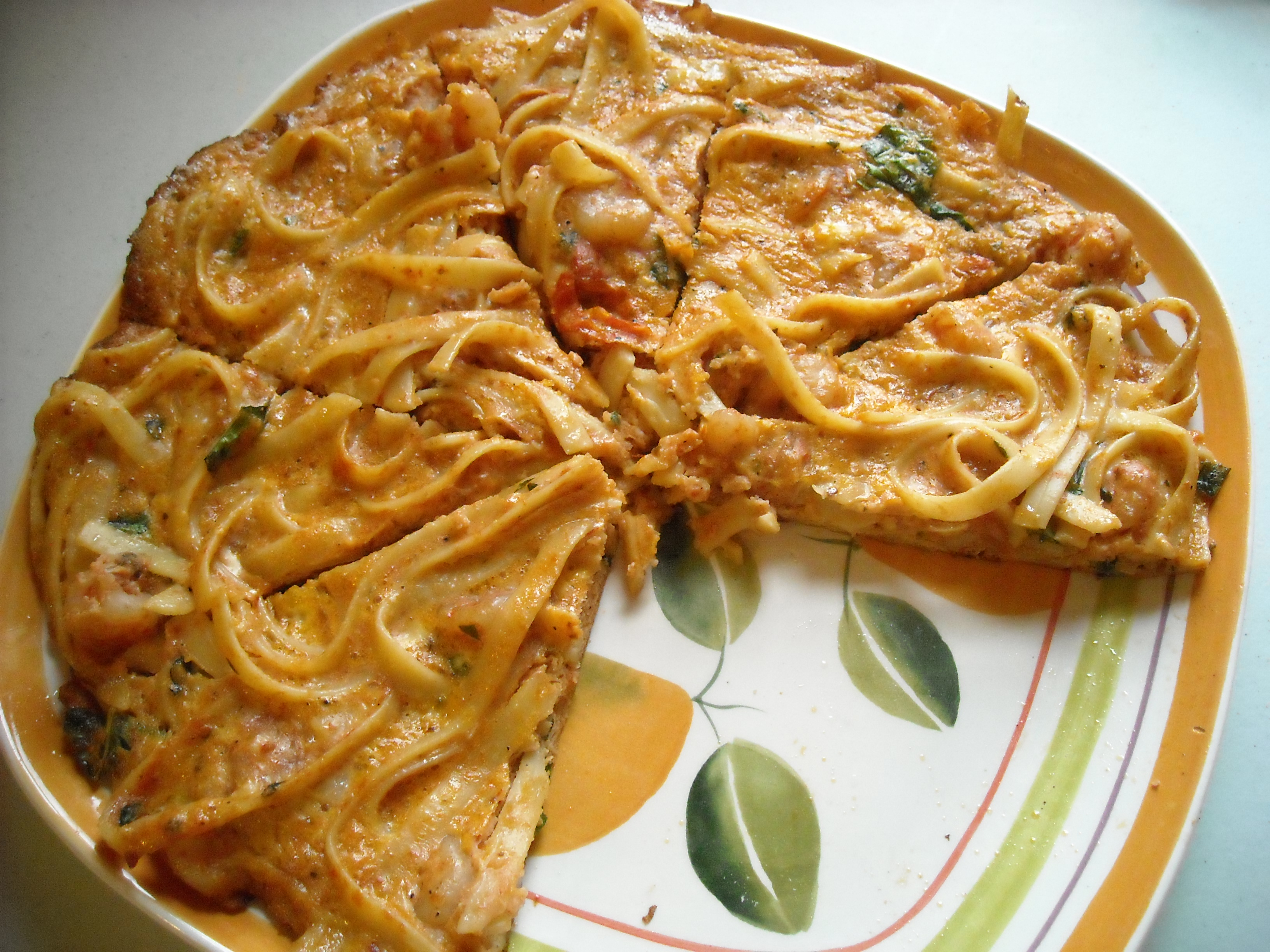 This works best with leftover spaghetti in its leftover sauce — whatever it is! My favorite has turned out to be leftover spaghetti in a tomato shrimp sauce (yes, including the shrimp).