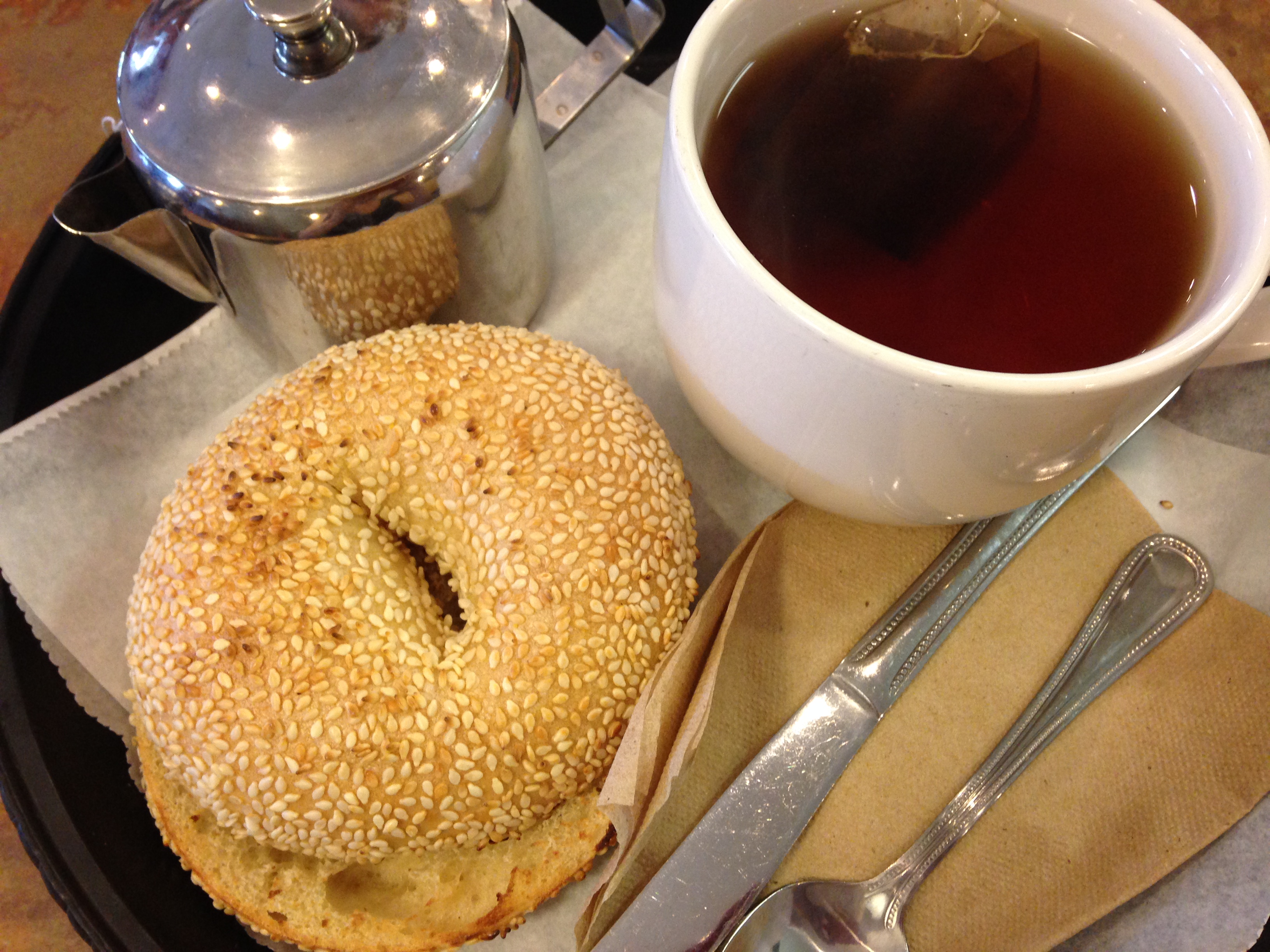 BTW they’ve got way more than bagels. Yummy muffins (I like the orange blossom one). Other sweet treats: brownies, danishes, scones, more. AND the main draw is their food-food. Sandwiches, salads, soups (they do a City Max special: half sandwich with soup or salad). The atmosphere is airy and tranquil and friendly. You can bring your computer and park all day but they don’t have WIFI (which is a good thing, otherwise I’d move in). You’ll want to adopt everyone who works there because they’re so NICE.
