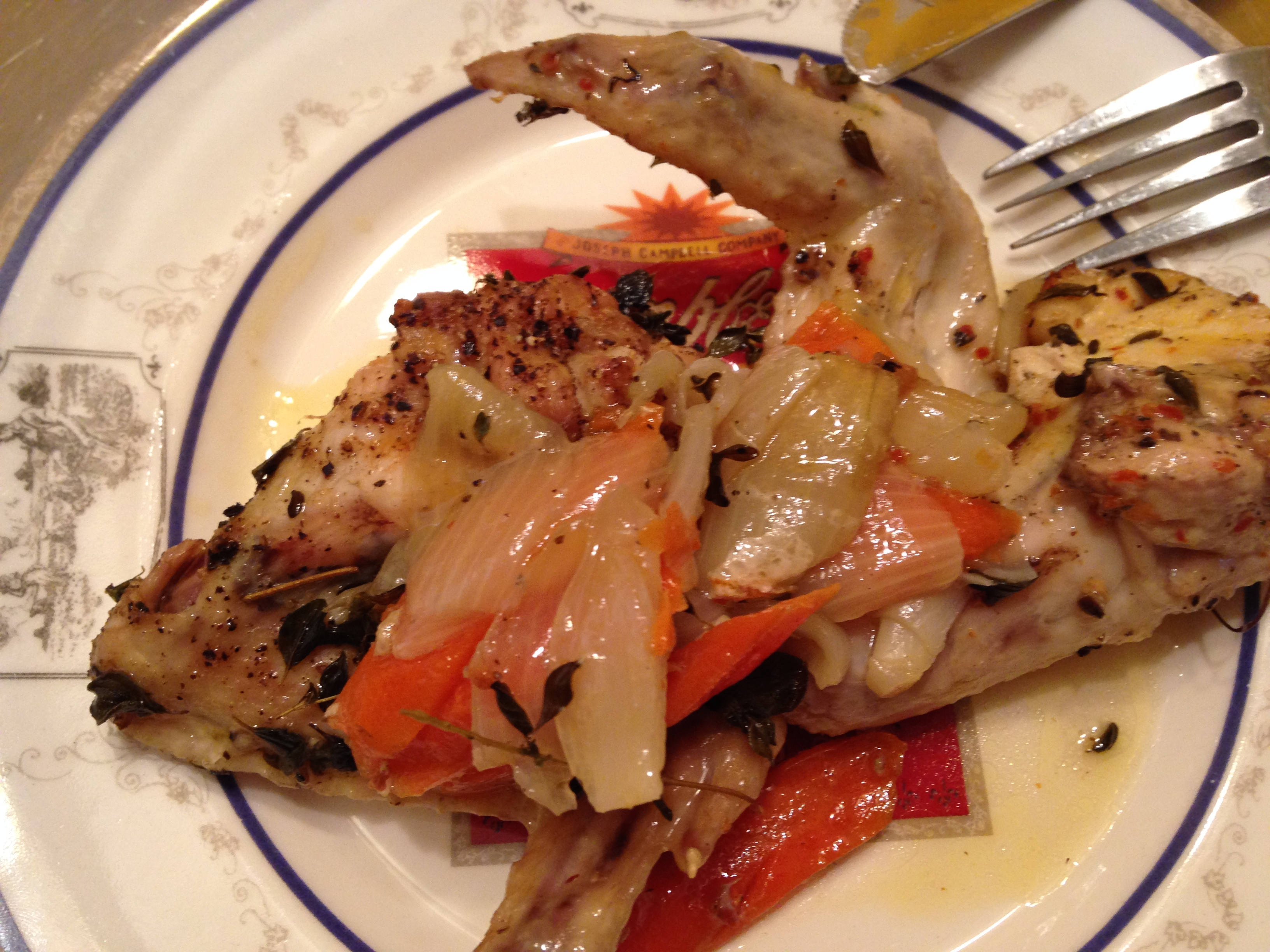 You will have a dinner that truly comforts you. Juicy. Flavorful. Tender. The carrots and onions are slippery-succulent. And the juices (with vegetables) must be spooned onto each serving. Here’s a couple of wings.
