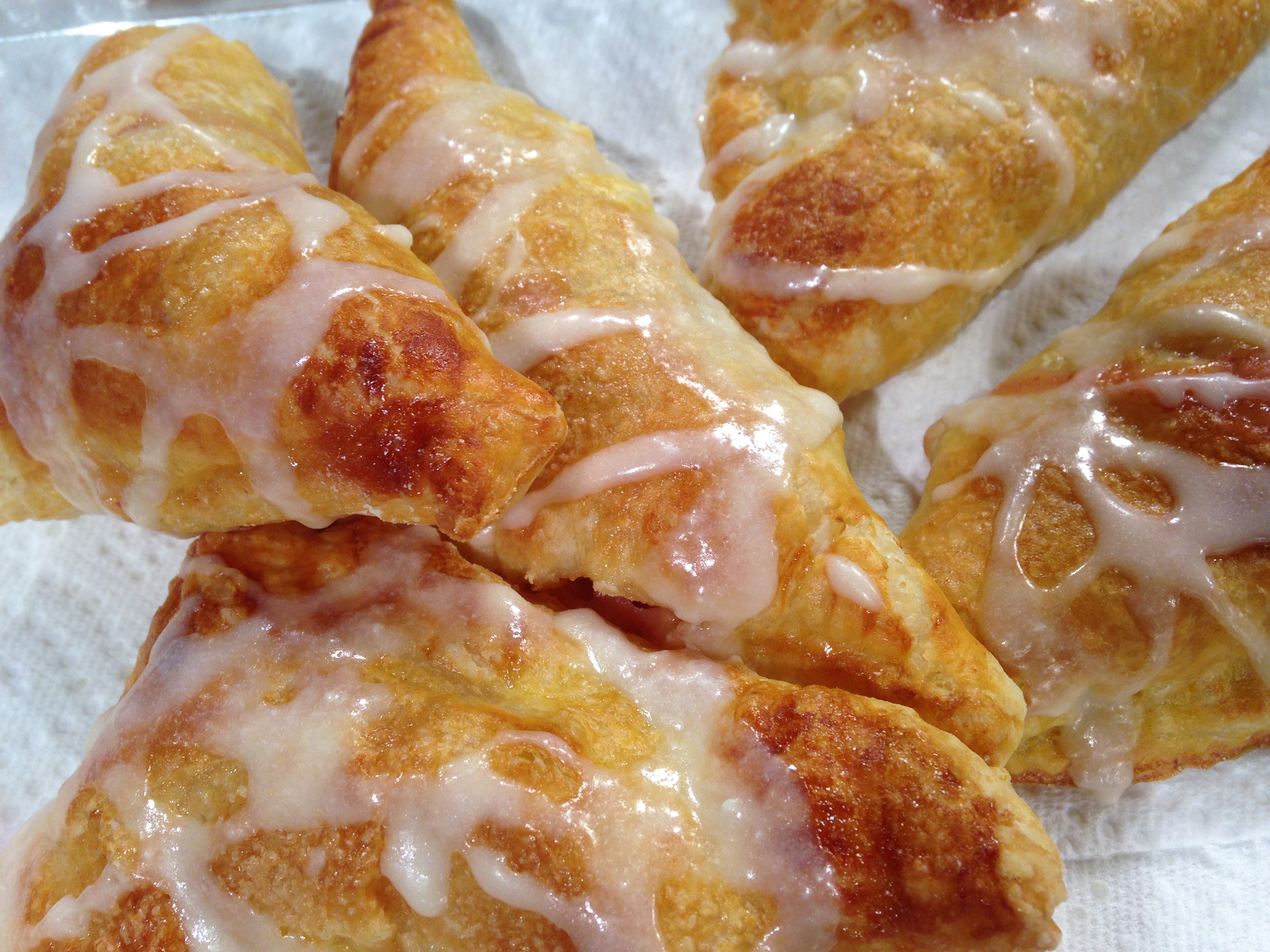 Roll out one of the dough sheets onto a lightly floured work surface until a little thinner. Cut into 3-inch squares. Place a teaspoon of fruit mixture in the center of each square, brush the edges of the dough with a little egg wash, and fold over into a triangle. Press edges together with fork tines. Brush each lightly with egg, make a small slit in the top. Place on a parchment-lined sheet pan. Repeat with the other sheet of dough. Re-roll leftover dough to make more. Bake turnovers in 400 degree oven for 20 minutes or until golden. Let cool. Drizzle lightly with icing in a zigzag pattern.