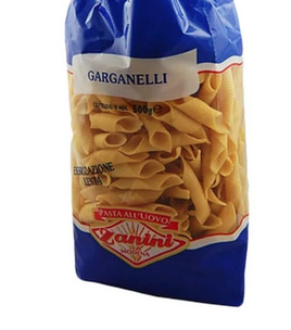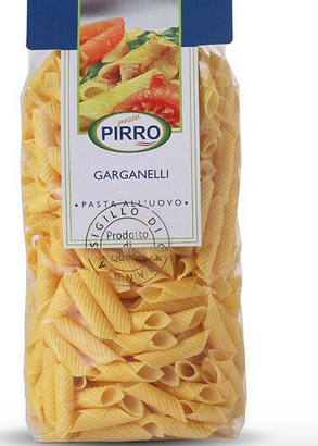 My favorite pasta is the shape: garganelli. It’s like penne but thinner, rolled on a diagonal, and often (or always) made with egg-based pasta. You can find it here! These are a couple of brands below.
