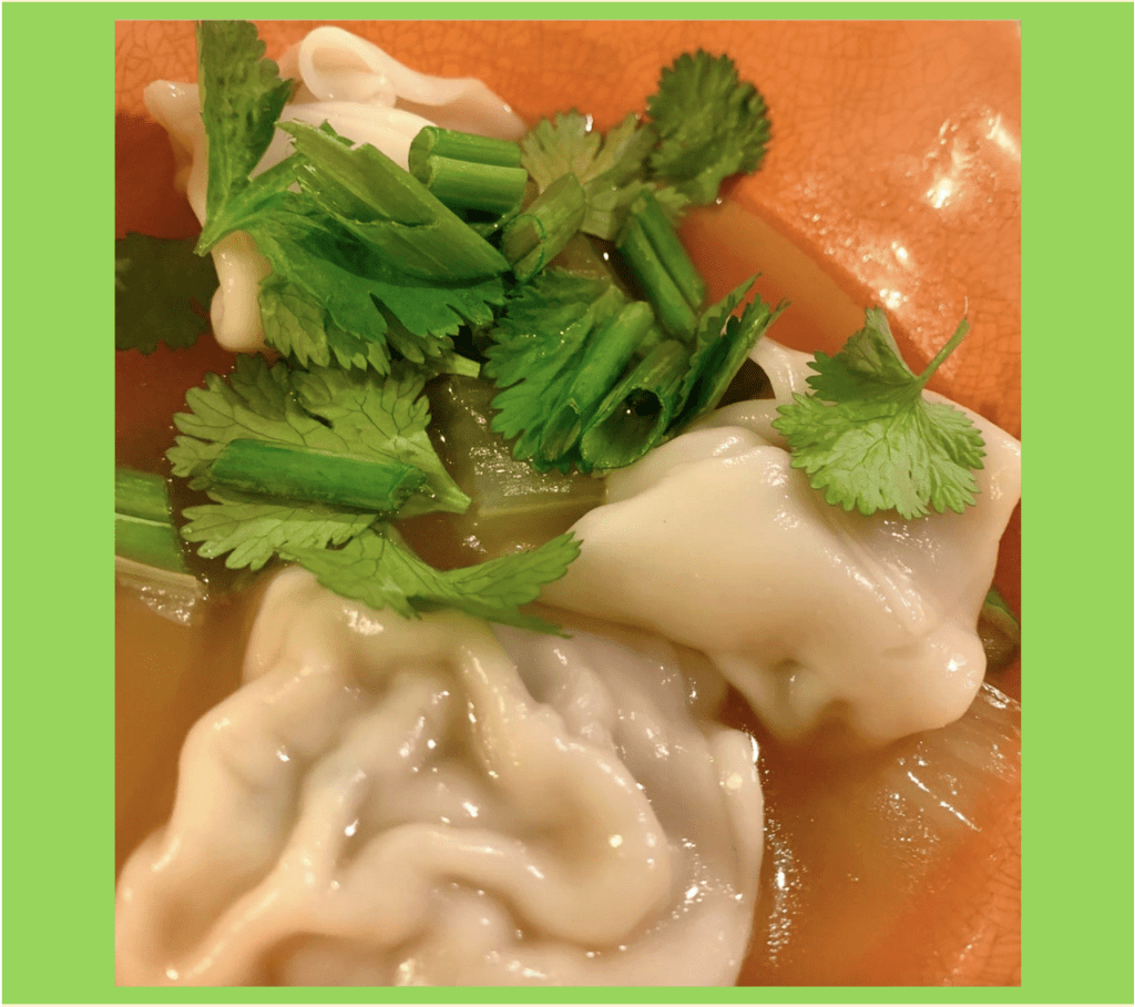 Wonton Soup with Homemade Pork Wontons, Snow Peas & Scallion