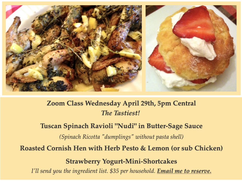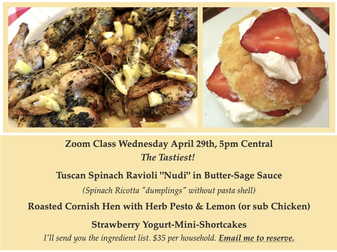 Classes run about 2 hours. I send you a list of recipe ingredient needs a week before. And our Zoom link the day before. EMAIL ME TO RESERVE (click): CHEFPAULETTE