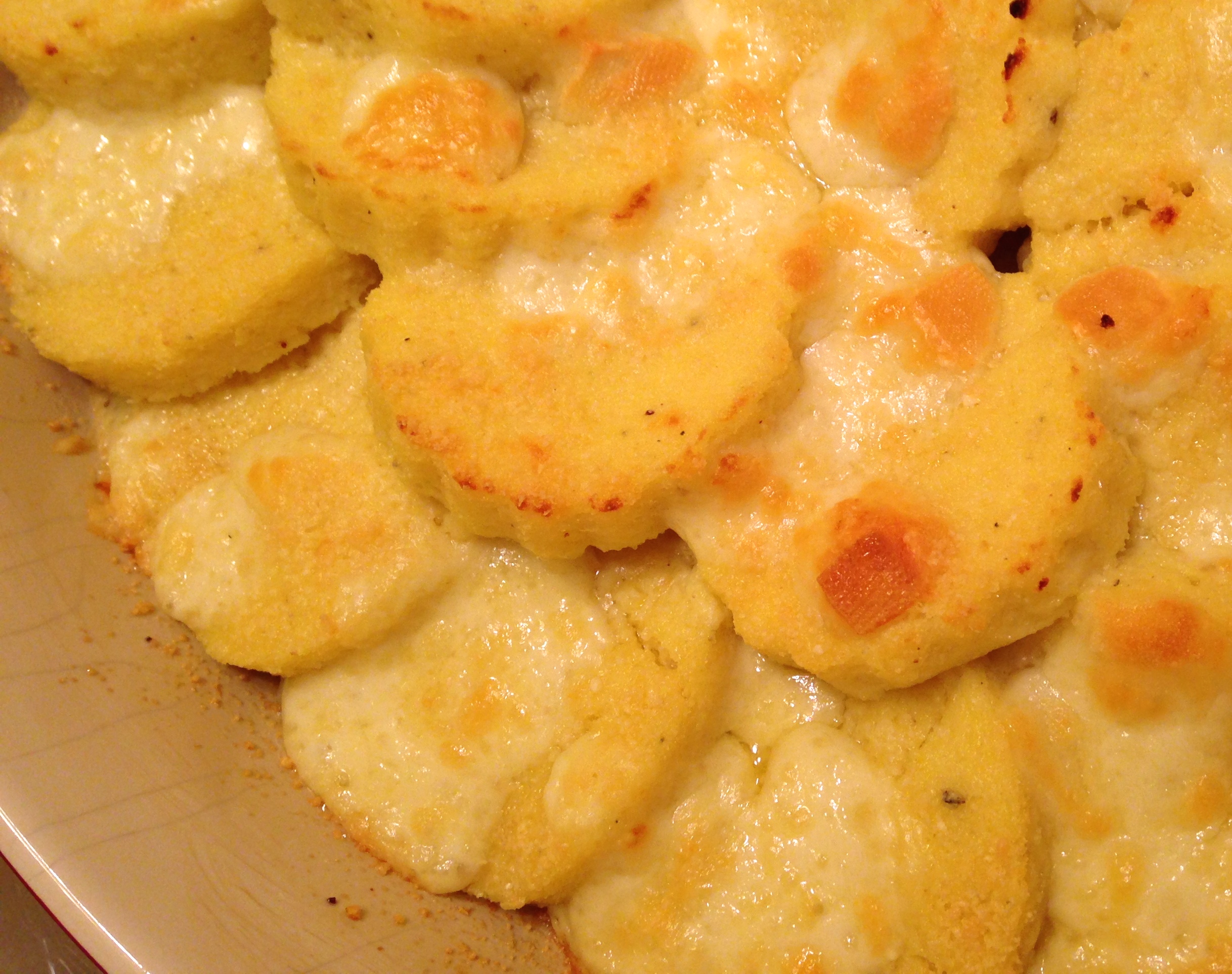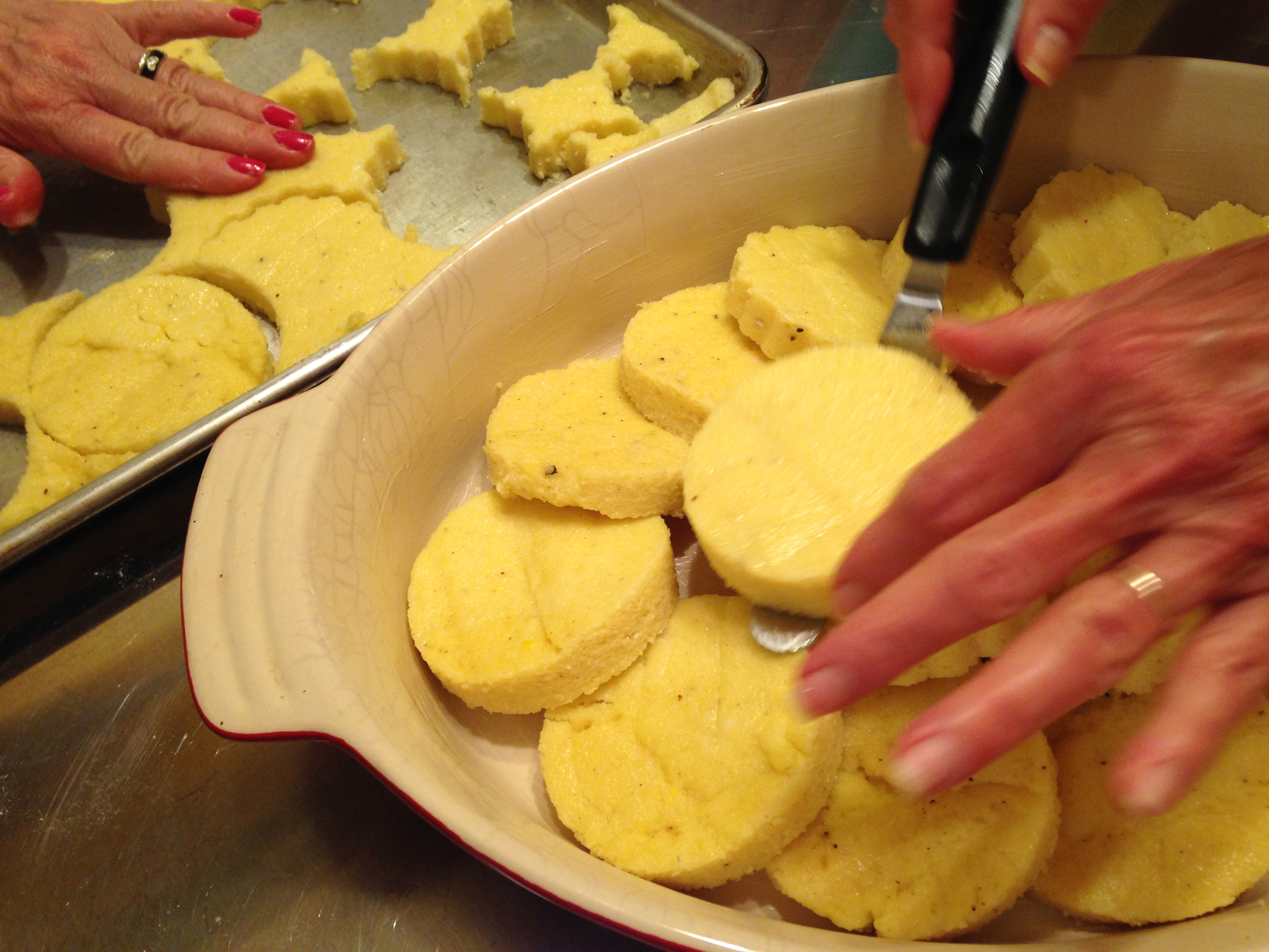 Gnocchi alla Romana is closer to polenta than those other little pillow gnocchi. It’s made from semolina flour. Stir it into simmering milk, with salt, pepper, grated cheese, butter, nutmeg, egg yolks…keep stirring until thickened. Then spread it out on a buttered sheet pan.