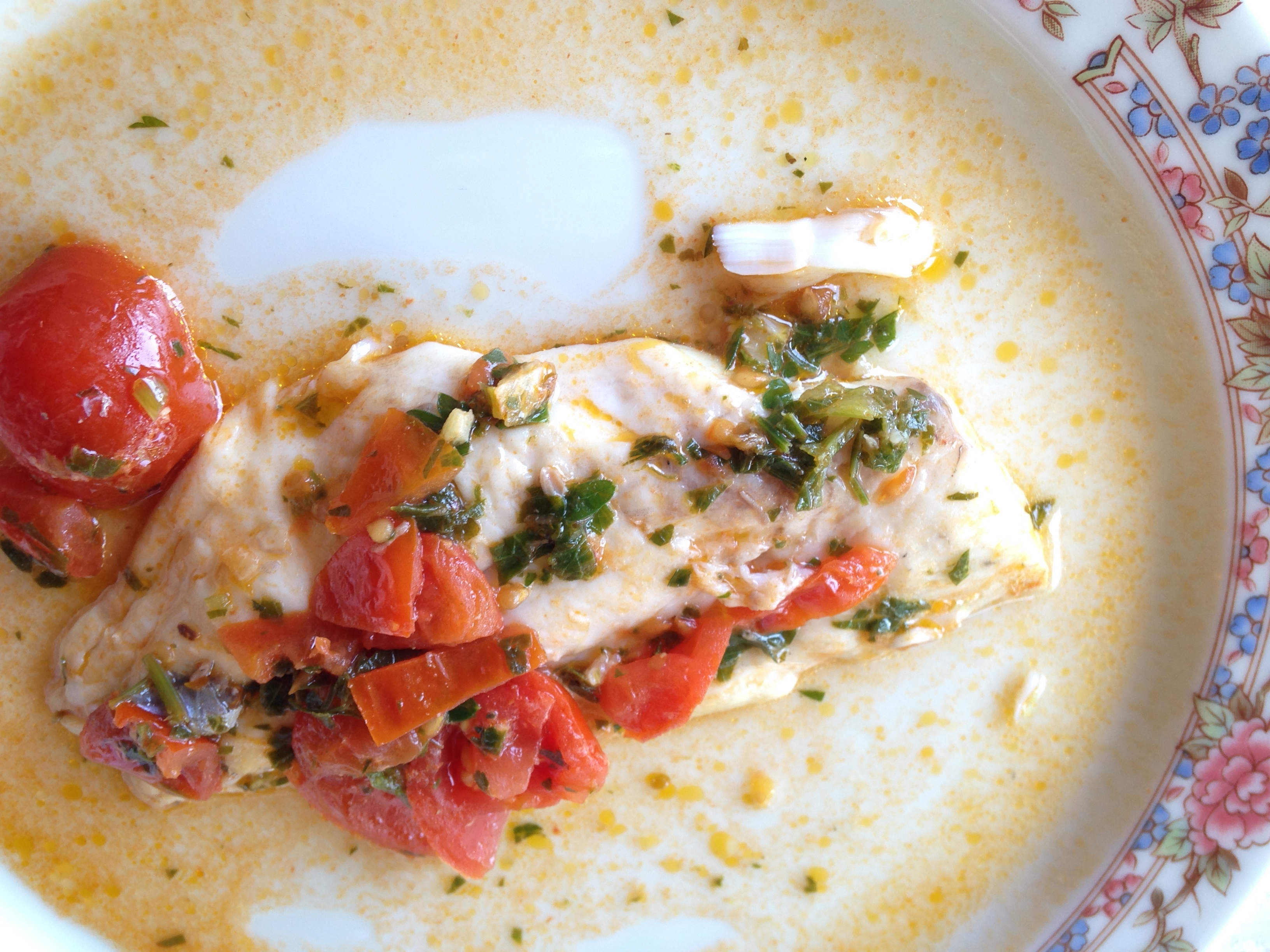 Serve in medium (pasta) bowls: a fillet, a couple of ladles of chunky broth, and a slice or two of toasted/or warm/or crunchy bread (I use baguette).