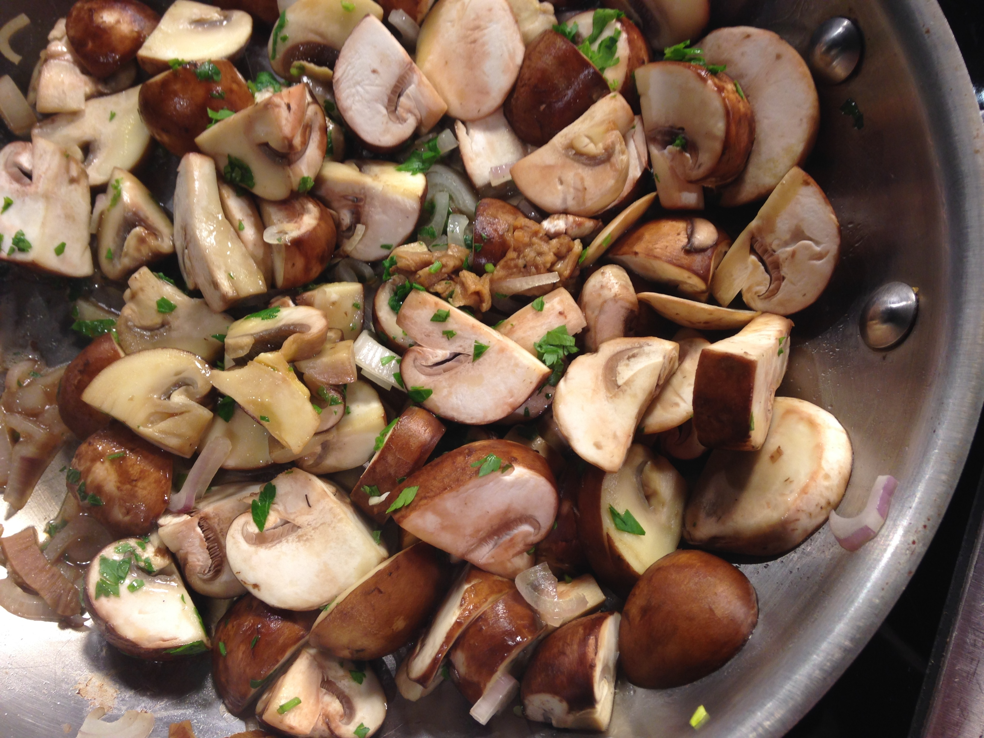 Lift the dried porcini mushrooms from the water. Pat dry. Mince slices and add to the cooking mushrooms. Cook 2-3 minutes more. Spoon in a couple of tablespoons of the soaking liquid, careful not to include the sediment at the bottom of bowl. Cook another minute or two at a lively heat. Season with salt & pepper, sprinkle with parsley. Serve.
